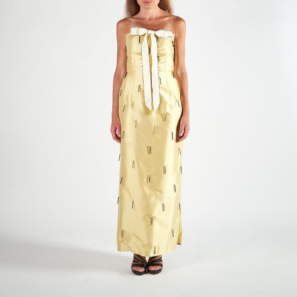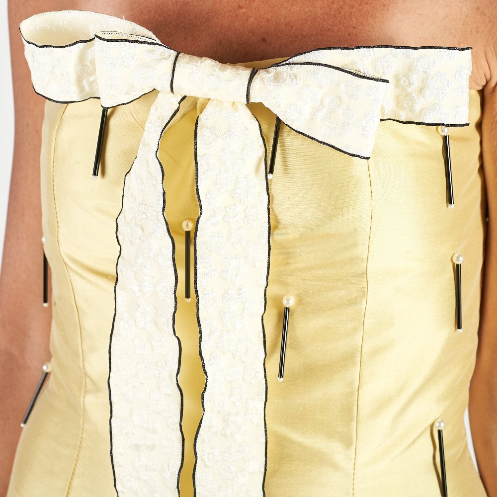 - Dettaglio spalline e scollo con bordino di perle e pietre;