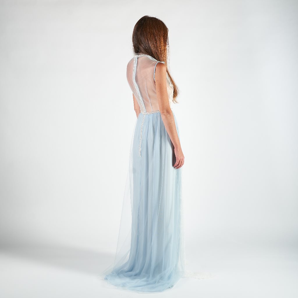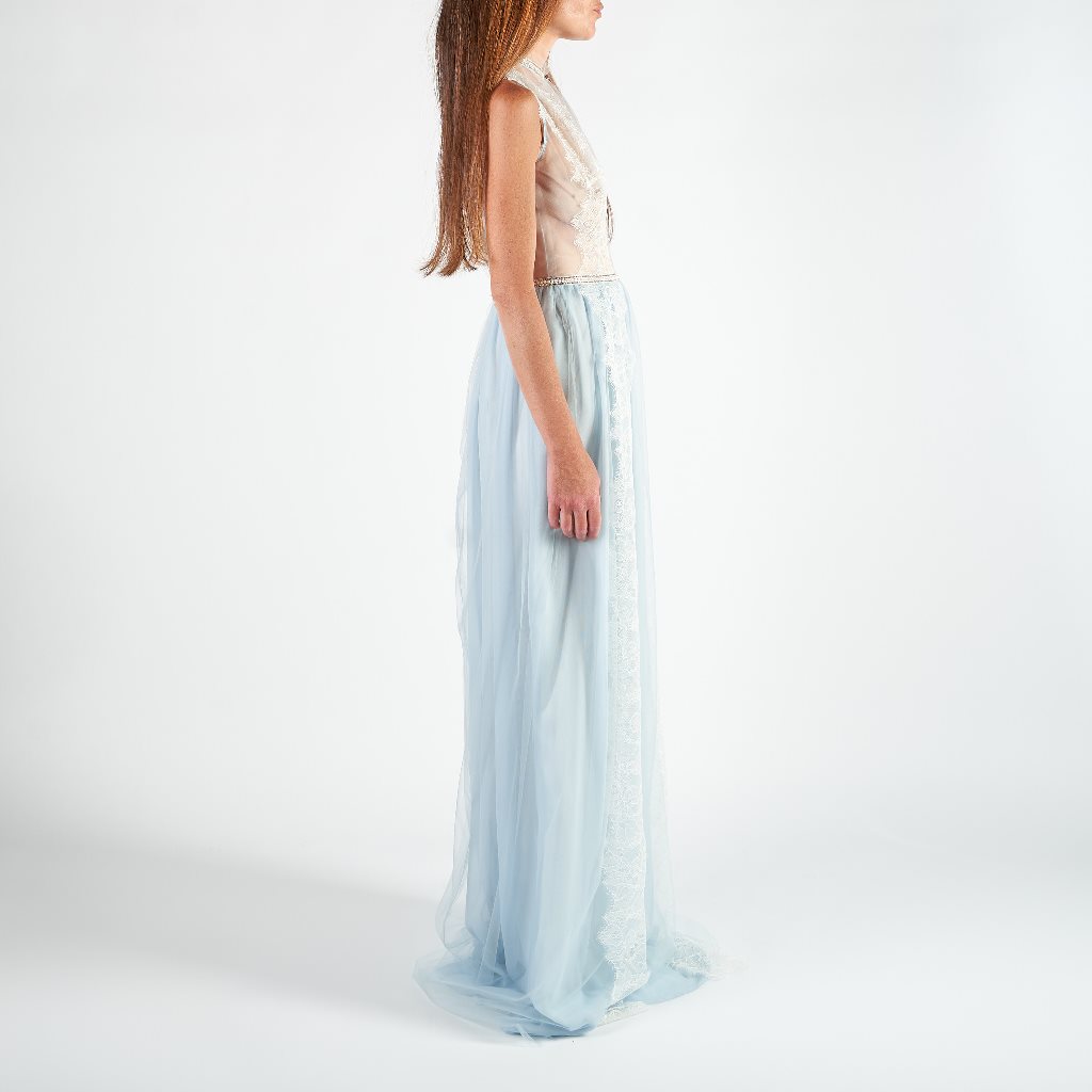 Lungo in tulle e chiffon 100% seta, questo abito mostra il dettaglio di bordo in pizzo color avorio sull’intero abito; un nastro con pietre e perle ed una chiusura posteriore con zip invisibile.