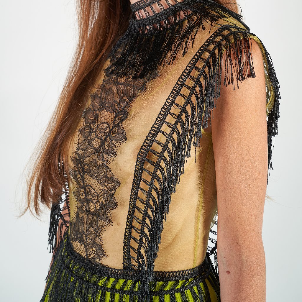 - Dettaglio scollo, maniche e cintura di bordo con frange lunghe color nero